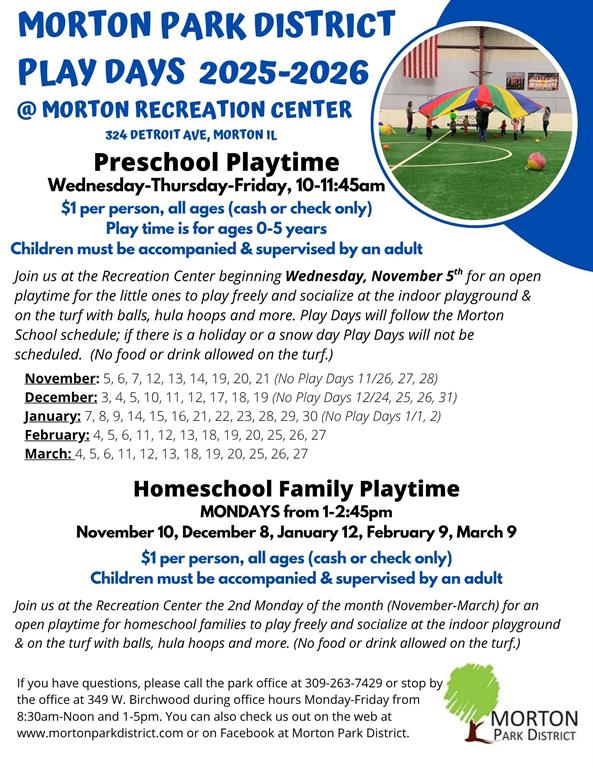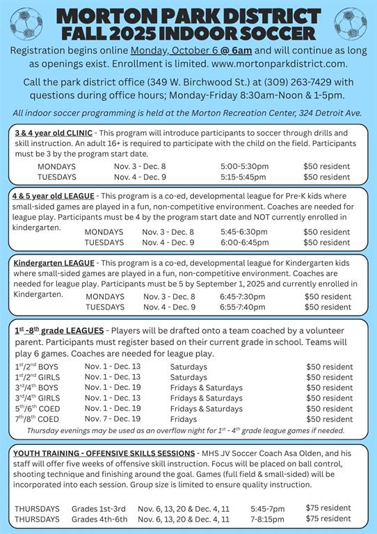 Just a reminder when signing up for any programs or activities, please check your account and make sure you have an updated email address for every person in your household and an updated phone number. We send out information throughout the year that is important and may affect a program that you or your child may be participating in. If you have questions about any program or activity don't hesitate to call the office at 309-263-7429, Monday-Friday 8:30am-12:00 & 1:00-5:00pm.
